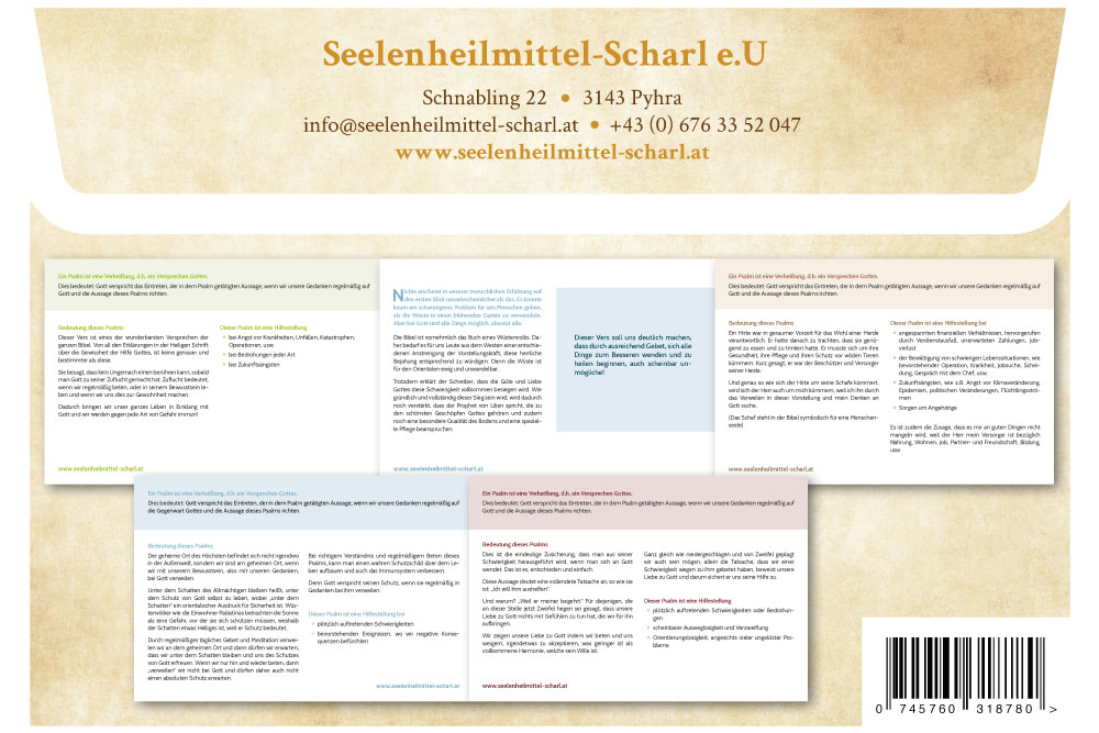 Ein Sammelband enthält 5 Karten, wobei auf der Vorderseite jeder einzelnen Karte, eine symbolische Darstellung eines Bibelpsalms oder Bibelverses angeführt ist, während auf der Rückseite die Interpretation und Deutung des Psalms oder Verses beschrieben wird.